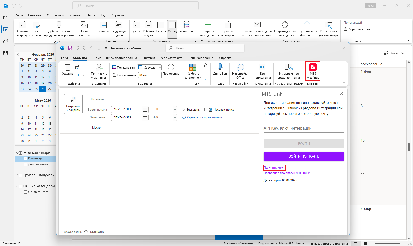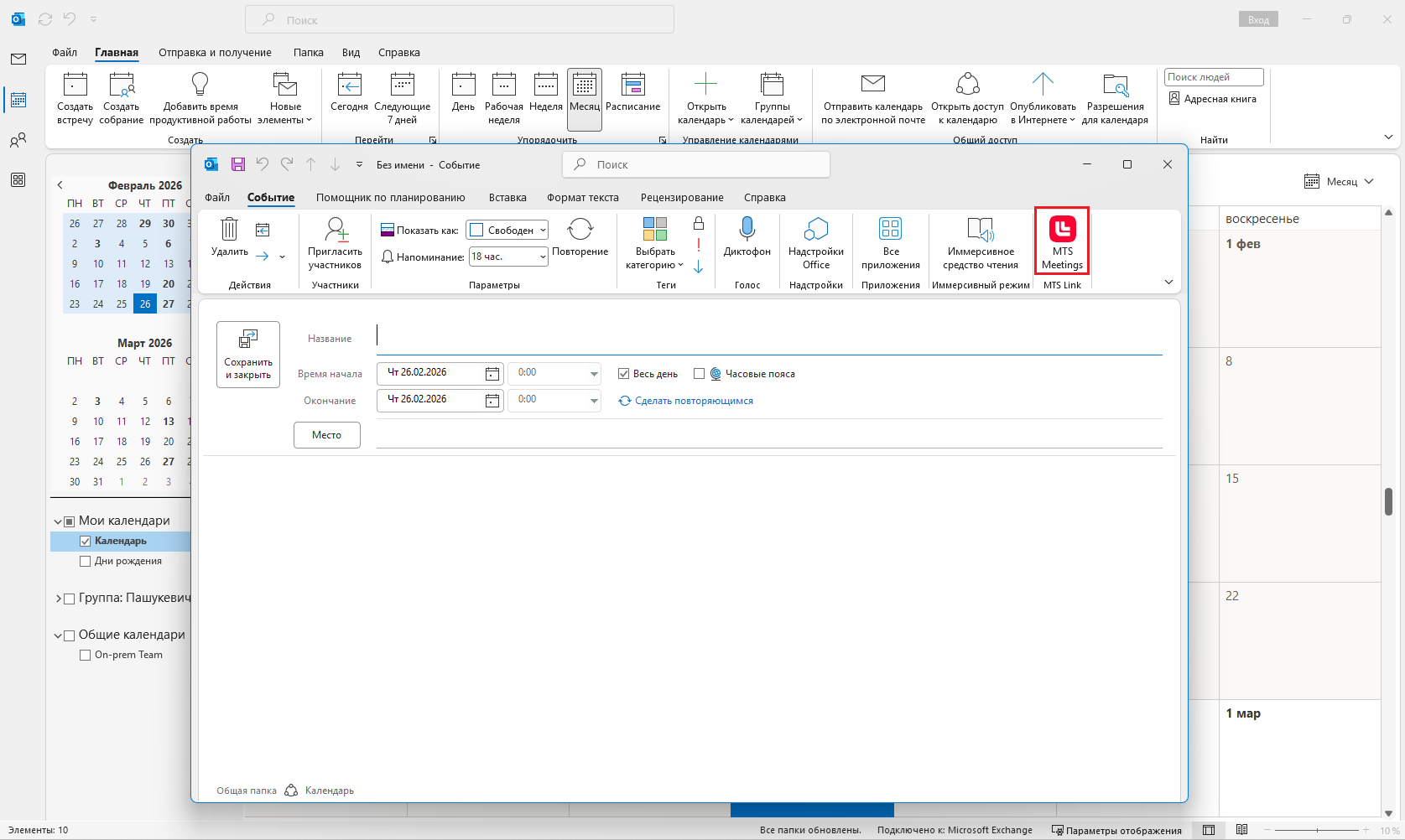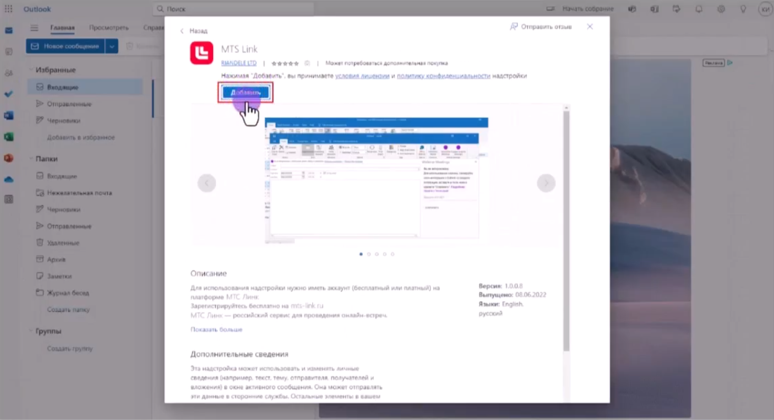 Для установки надстройки в десктопное приложение Microsoft Outlook ничего делать не нужно — после установки в веб‑версии нужная кнопка появится в приложении автоматически. Единственное отличие — она будет называться «MTS Meetings».