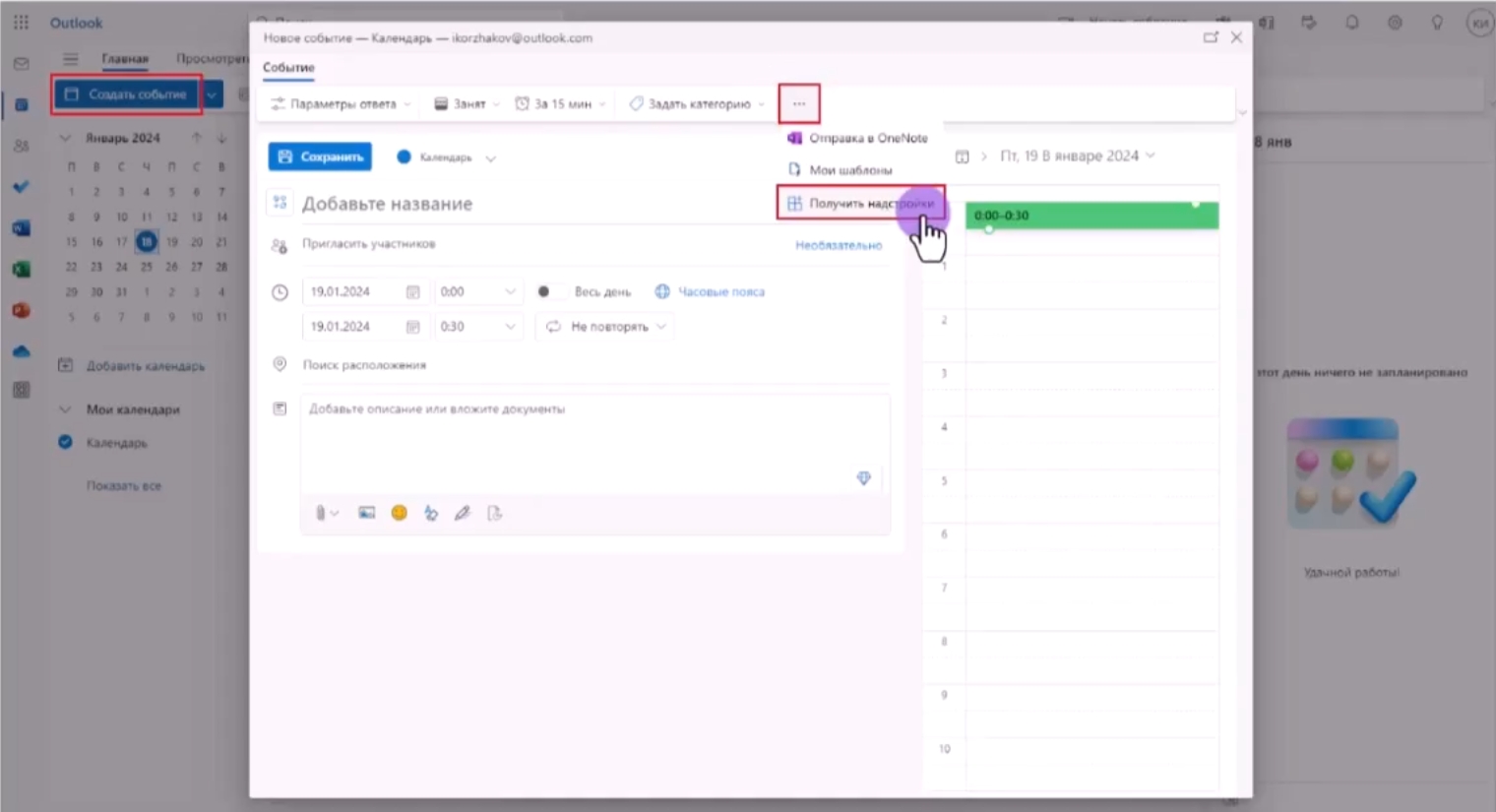В левом верхнем углу страницы календаря Outlook нажмите «Создать событие», затем на панели инструментов выберите троеточие и пункт «Получить надстройки»