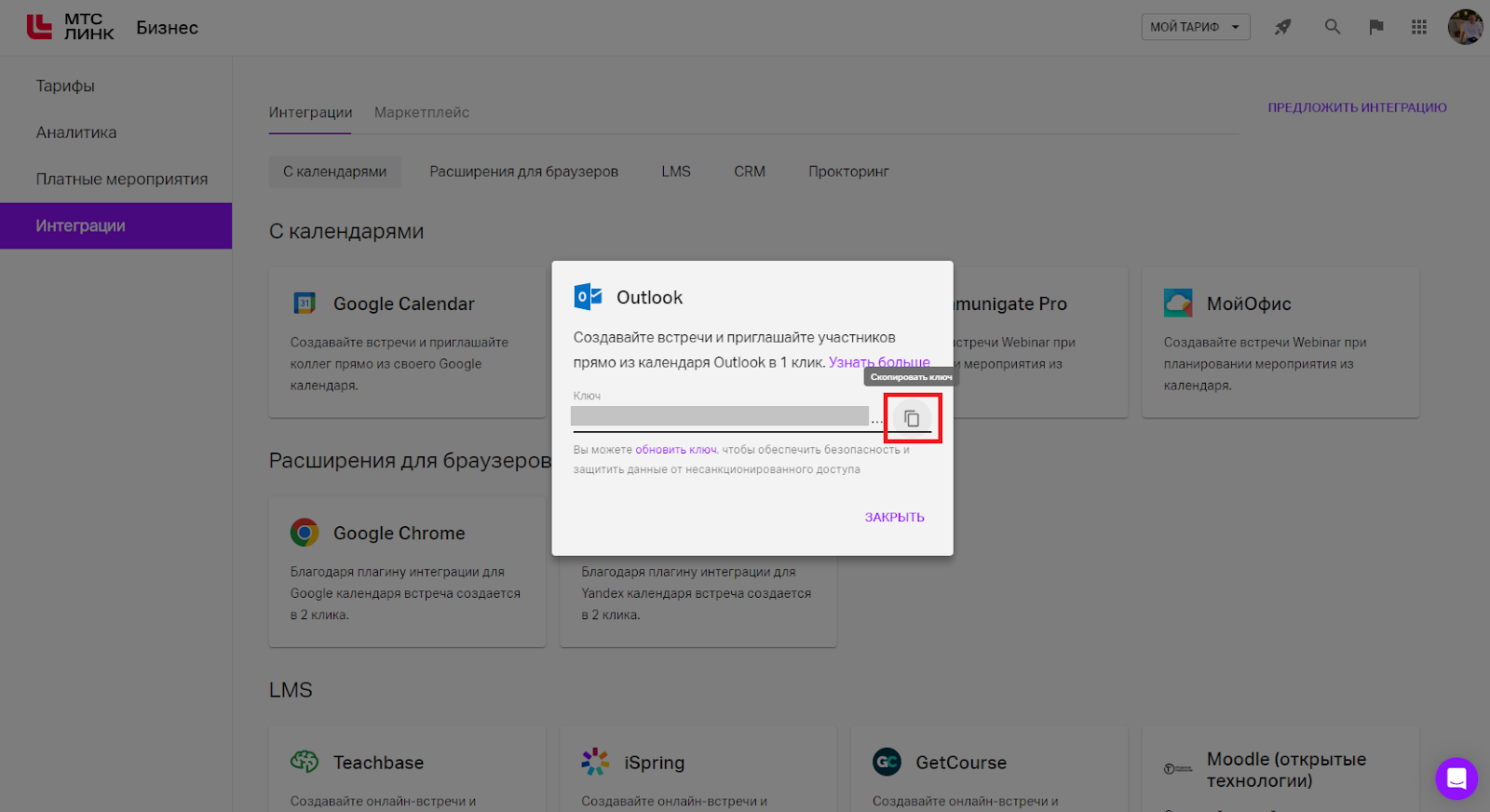 Откроется раздел «Интеграции» личного кабинета платформы МТС Линк. Нажмите на «Outlook» и в открывшемся окне скопируйте ключ