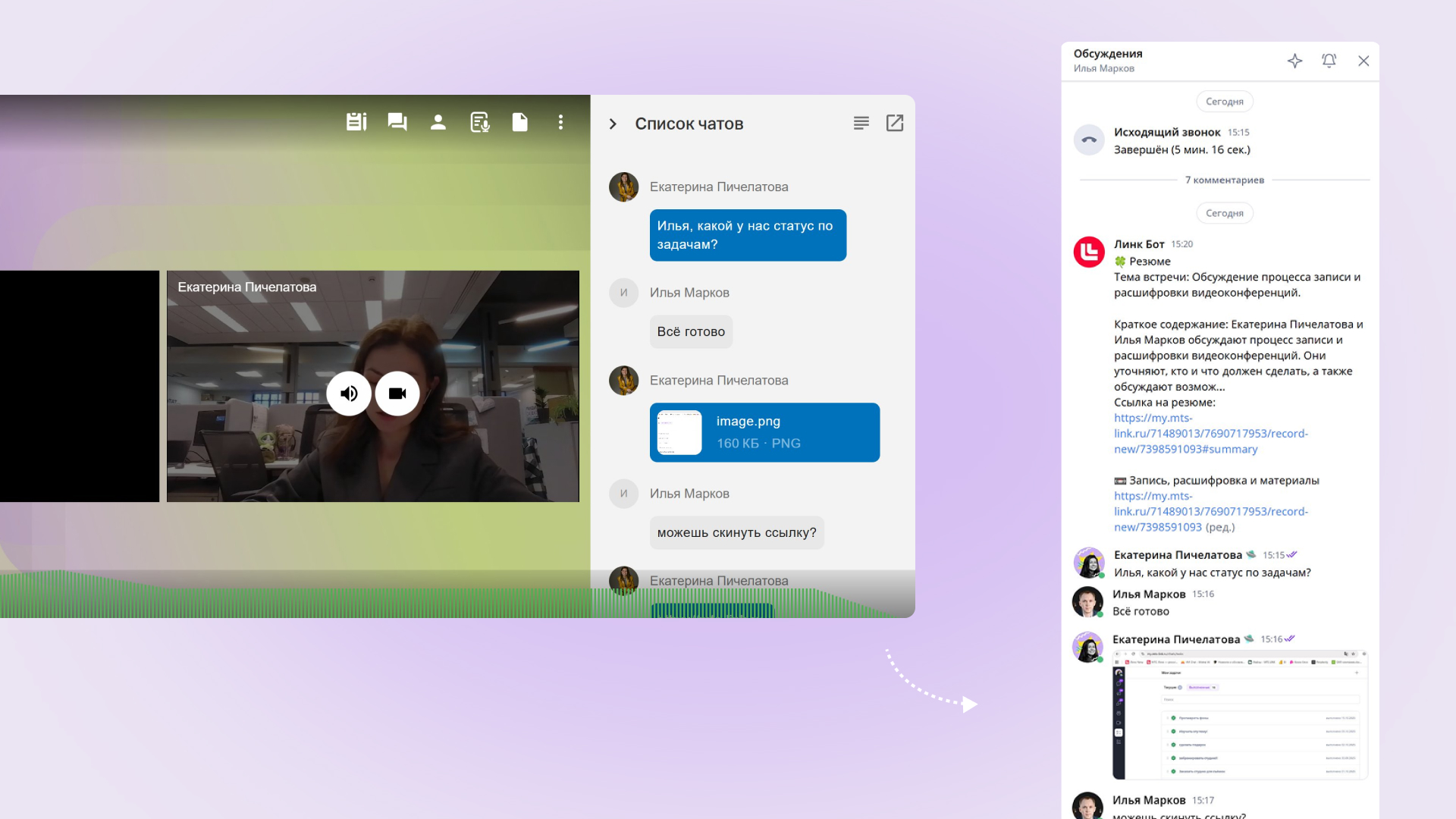 После завершения звонка все сообщения и артефакты появятся в чате или канале, где был начат звонок. Переписка, скриншоты, презентации, а также ссылка на запись и расшифровку будут в комментариях к уведомлению. Так вы сможете продолжить обсуждение, упомянуть участников, взять в работу документы или посмотреть резюме встречи.