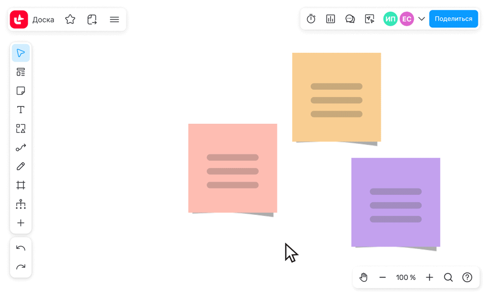 Стикеры могут быть разных цветов, их можно поворачивать, менять масштаб — это поможет визуально выделять главные мысли и идеи.