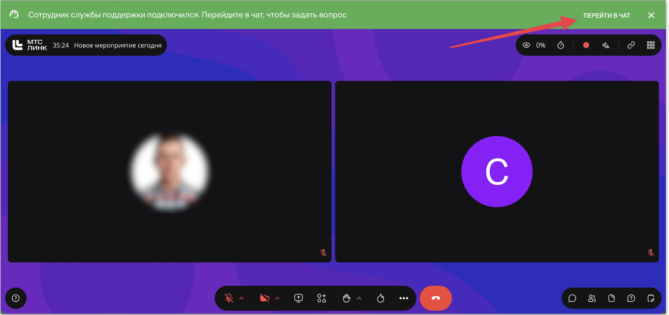 3. Как только сотрудник подключится, у вас в мероприятии появится уведомление, из которого можно перейти в индивидуальное общение с сотрудником поддержки, без необходимости покидать мероприятие:
