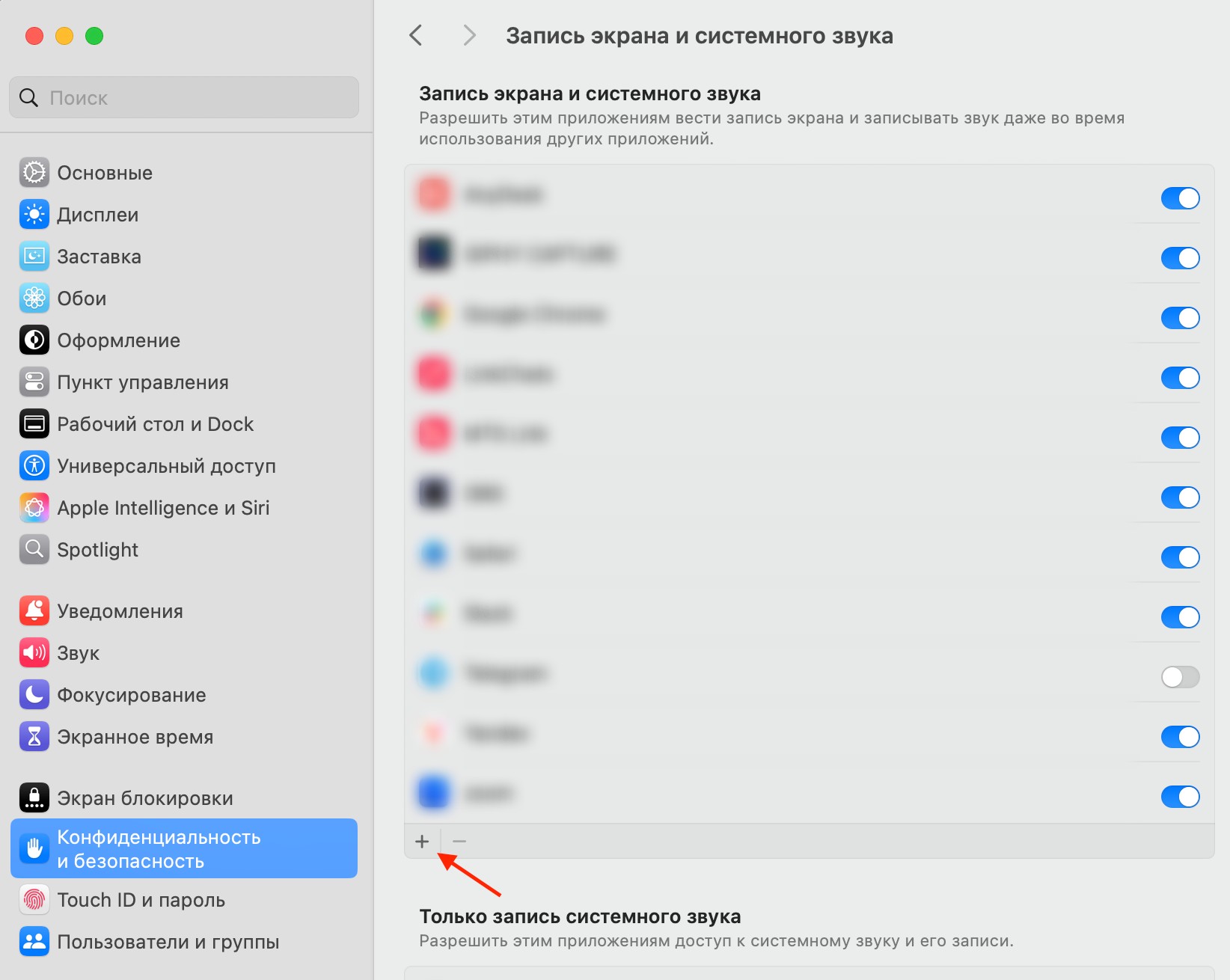Для корректной работы функции "Демонстрация экрана" на устройствах с macOS необходимо разрешить доступ записывать экран для браузера и десктопного приложения, с которого происходит вещание.