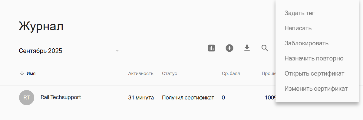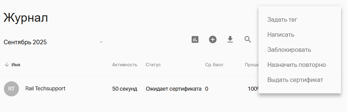 Если выбрана ручная выдача сертификата, то при завершении курса участником в журнале напротив его записи отображается статус "Ожидает сертификата", а в контекстном меню справа отображается пункт "Выдать сертификат"