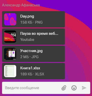 Участники встречи или вебинара могут обмениваться файлами в чате, если в настройках включена настройка "Управлять файлами". Можно делиться через скрепку, перетаскивание и буфер обмена. Более подробно в статье Обмен файлами в чате.
