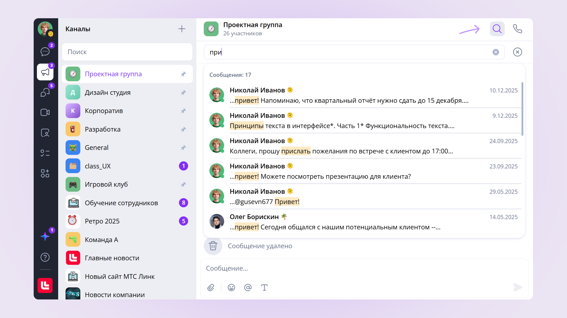Дополнительная возможность: администраторы могут удалять чужие сообщения — подключаем эту возможность по запросу через менеджера или техподдержку.