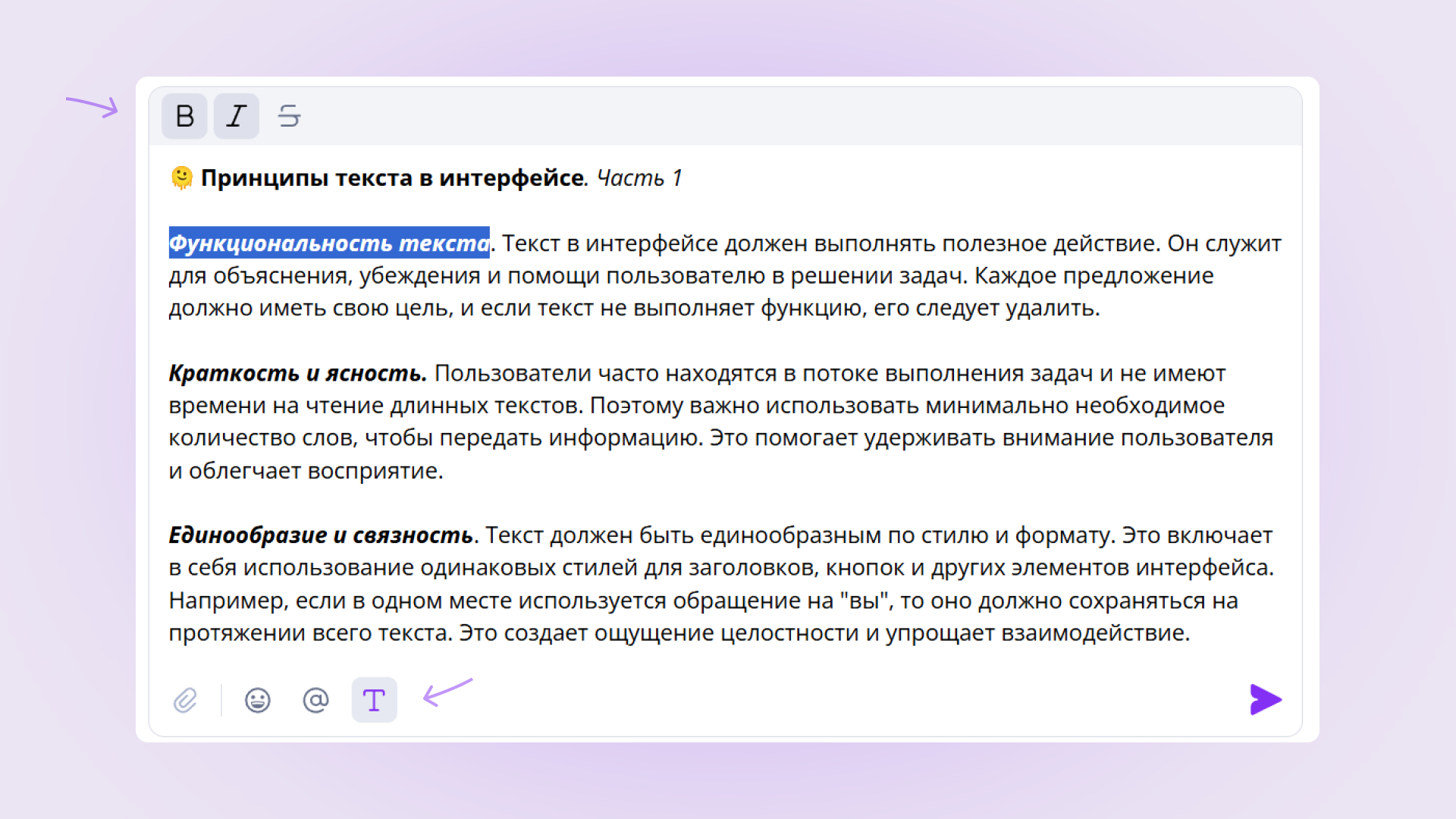 Вы можете отправлять сообщения в личных и групповых чатах, каналах и тредах. Введите текст в поле для ввода, а затем кликните по значку отправки или клавише Enter.