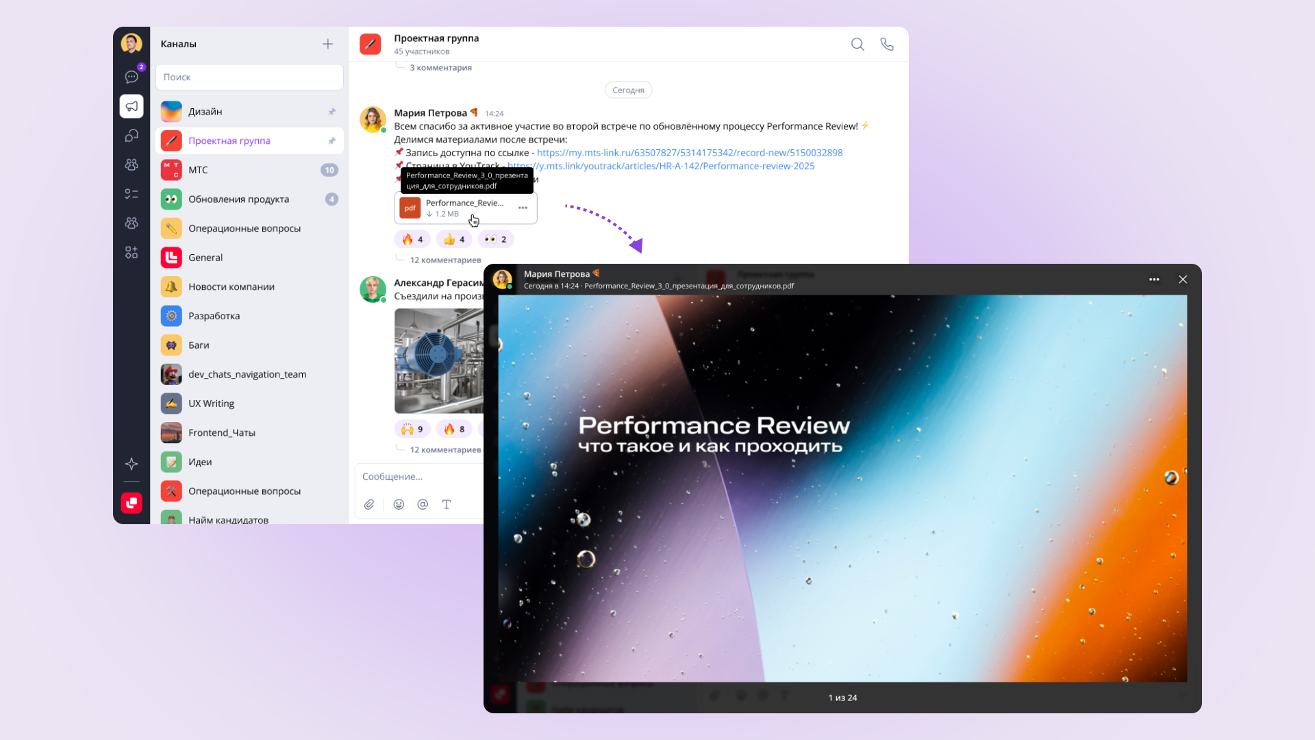 Как открыть: нажмите на отправленный pdf-файл в ленте чата или канала.