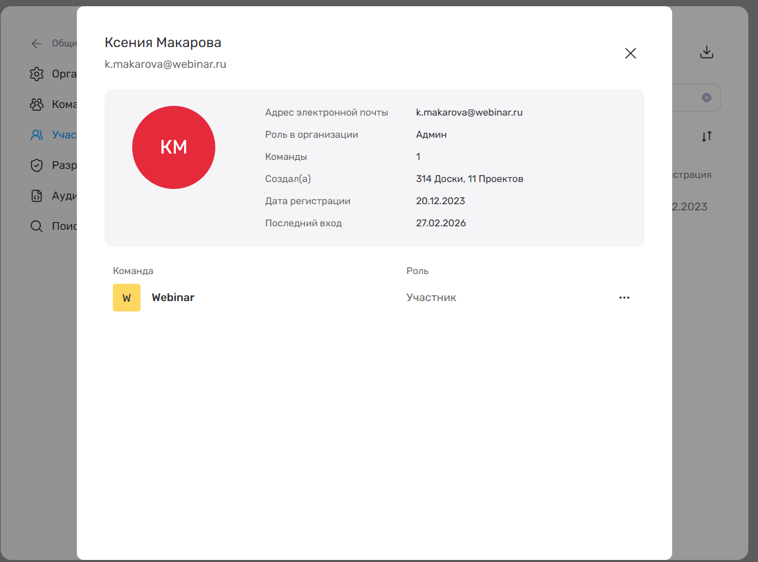 Также для админа теперь доступна подробная информация про каждого участника команды на одной вкладке: cколько у участника команды есть досок, проектов и команд, когда он зарегистрировался и последний раз заходил в сервис.