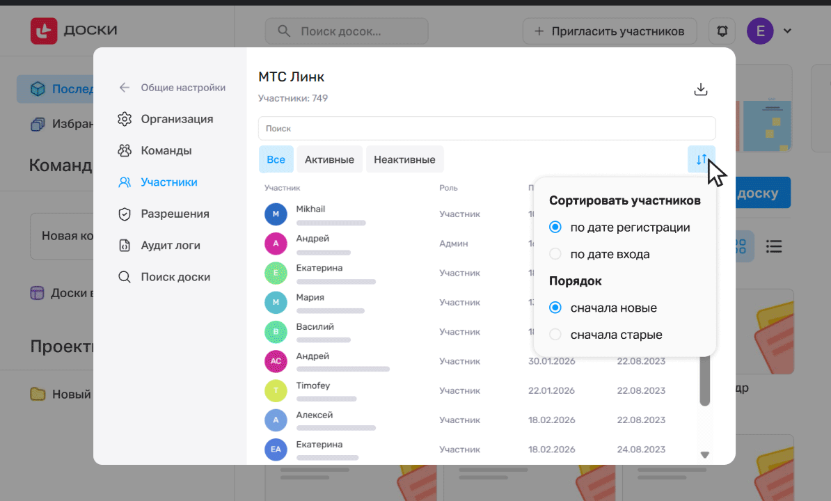 - cписки участников можно выгрузить в CSV — например, чтобы сделать рассылку для неактивных пользователей, а также фильтровать всех участников организации: по дате регистрации и последнему входу в Доски.