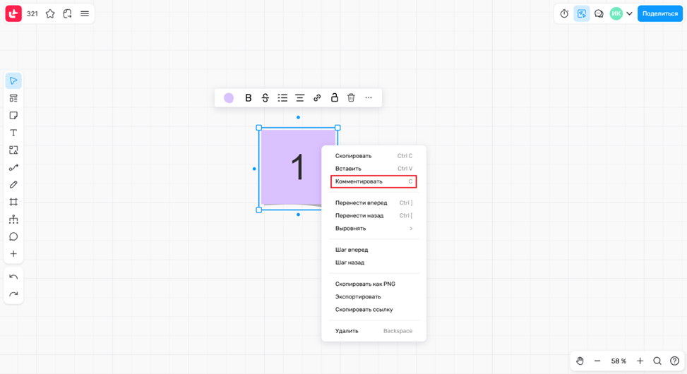 Для создания необходимо кликнуть правой кнопкой мыши в любом свободном месте или по размещенному на доске объекту и выбрать «Комментировать»: