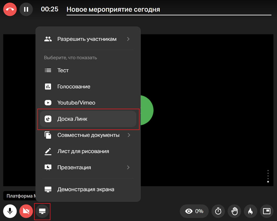 Также можно попасть на доску внутри комнаты мероприятия перейти в меню демонстрации экрана и выбрать пункт «Доска Линк»: