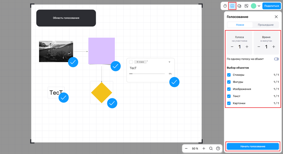 Для начала голосования необходимо выбрать область с объектами (стикеры, фигуры, изображения, текст, карточки) и нажать на кнопку «Голосование» на панели в правом верхнем углу. Откроется панель, где на вкладке «Новое» можно выбрать количество голосов, доступное для одного участника, определить, сколько времени будет идти голосование, установить возможность отдавать только один голос на объект. При необходимости можно добавлять и исключать объекты, кликая на них в выбранной области доски или ставя/снимая галочку в панели настроек голосования. После выбора всех настроек необходимо нажать на кнопку «Начать голосование»: