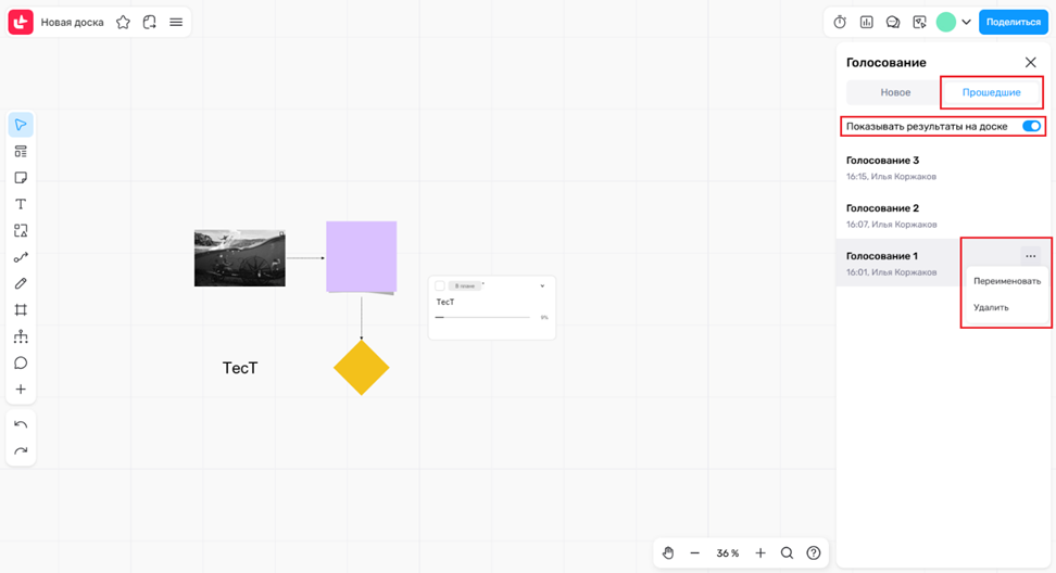 На вкладке «Прошедшие» можно посмотреть результаты голосований, которые были проведены на доске. Для этого нужно однократно кликнуть правой кнопкой мыши по нужному. Также можно включать/отключать отображение результатов на доске, переименовывать или удалять голосования: