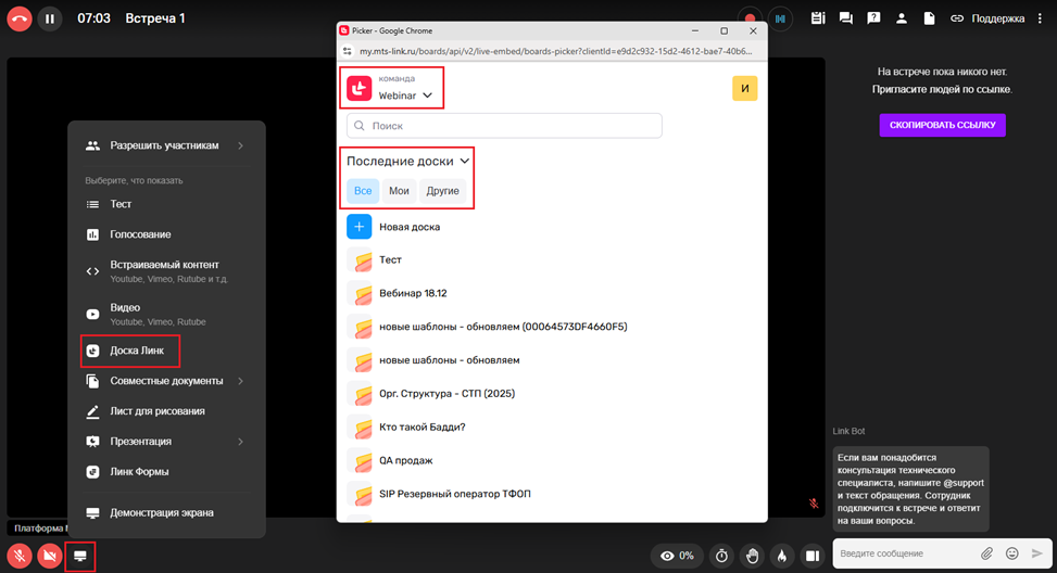Также можно открыть доску внутри комнаты мероприятия. Для этого необходимо перейти в меню демонстрации экрана и выбрать пункт «Доска Линк». Откроется окно, в котором можно выбрать доску в нужной команде и отфильтровать по типу доски (Последние, Избранные, Доски в этой команде) и по владельцу доски (Все, Мои, Другие):