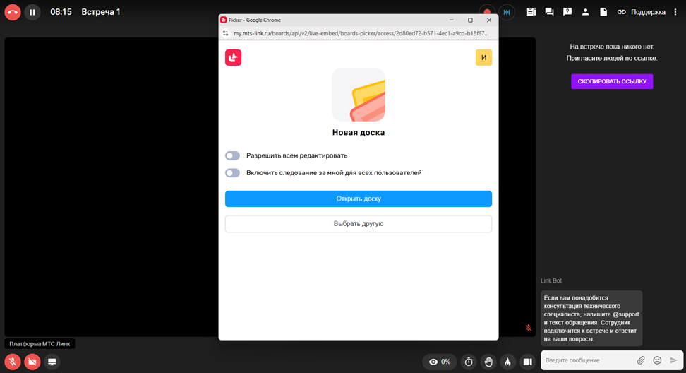 После нажатия на кнопку «Открыть доску» она откроется в комнате мероприятия и на ней можно будет выполнять все доступные действия.