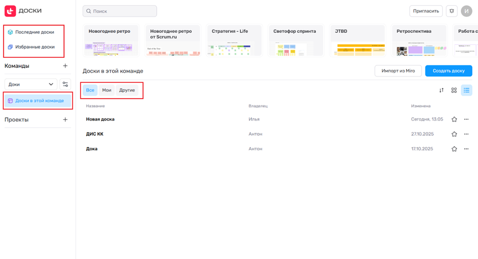 Далее в меню откроются все доски, доступные в выбранной в Miro команде. Необходимо выбрать нужные и нажать на «Импортировать».