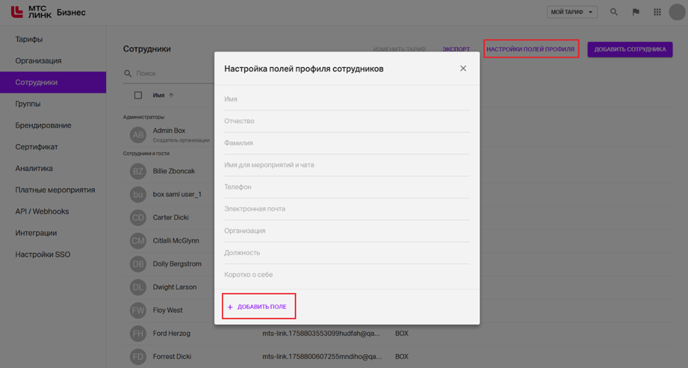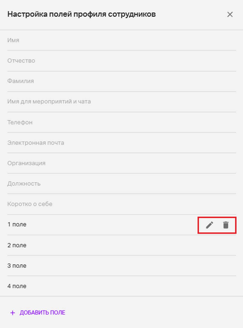 По нажатию на кнопку «Настройка полей профиля» слева от кнопки «Добавить сотрудника» будет открываться окно, в котором будут отображаться поля, недоступные для изменения, и кнопка «Добавить поле»: