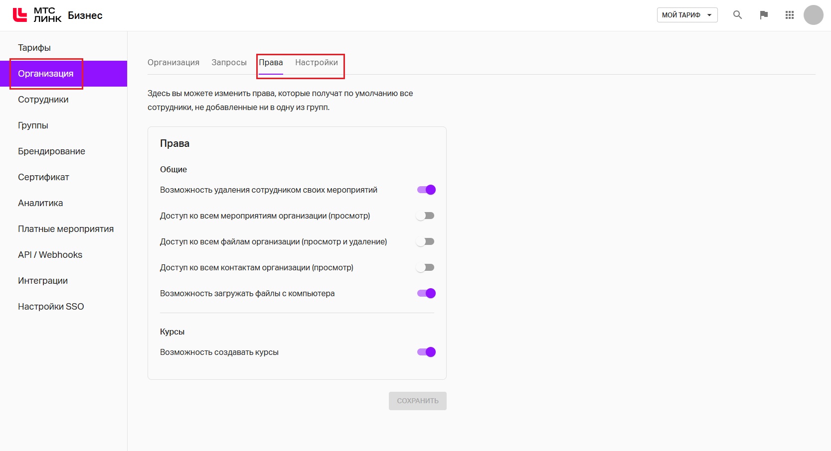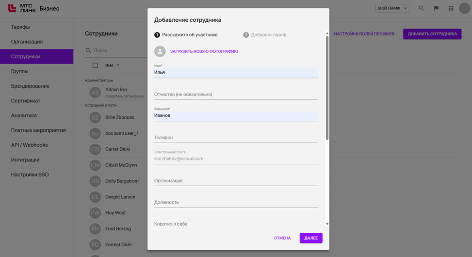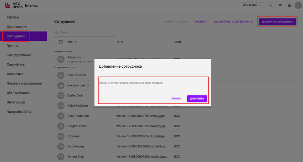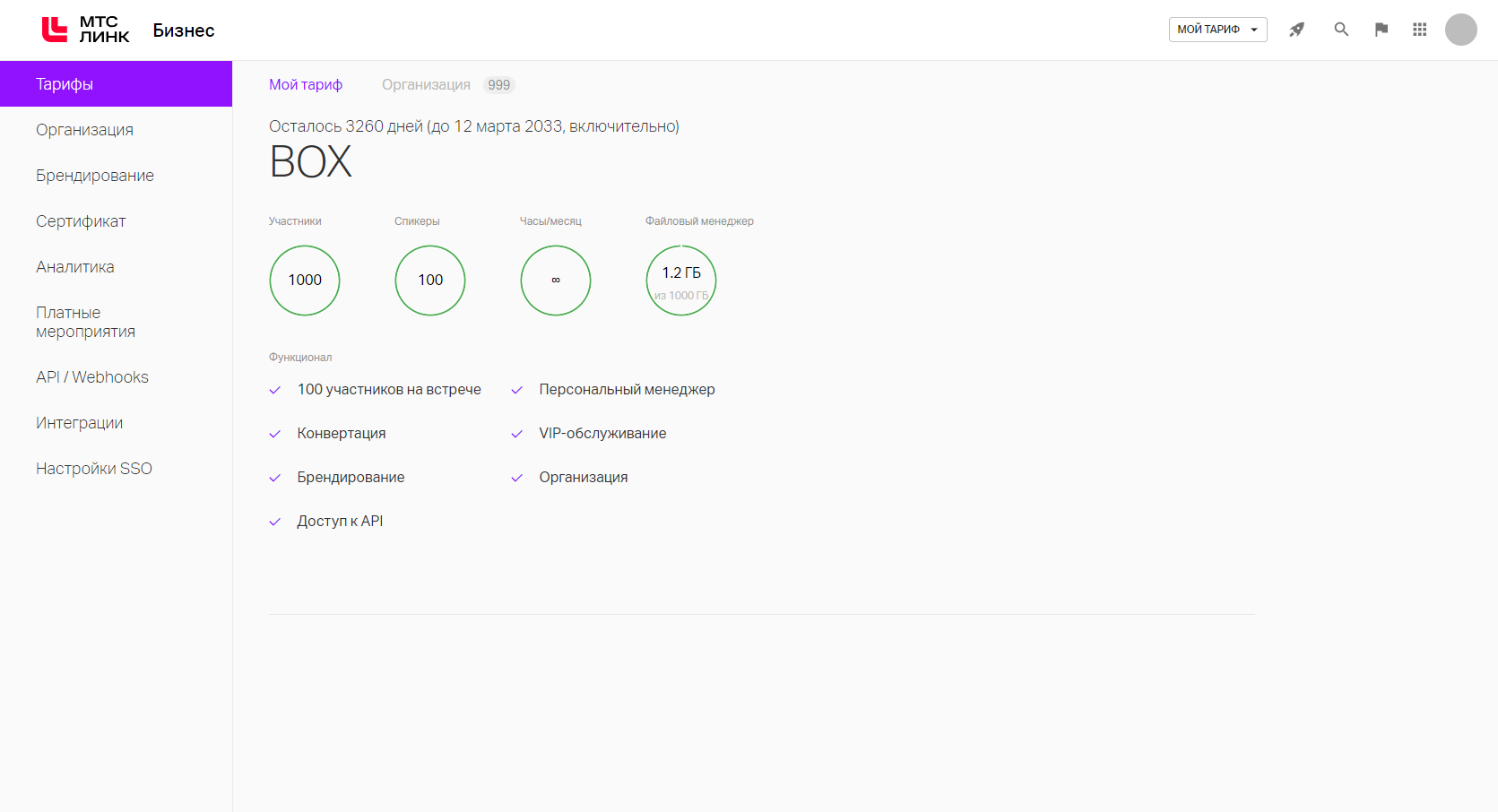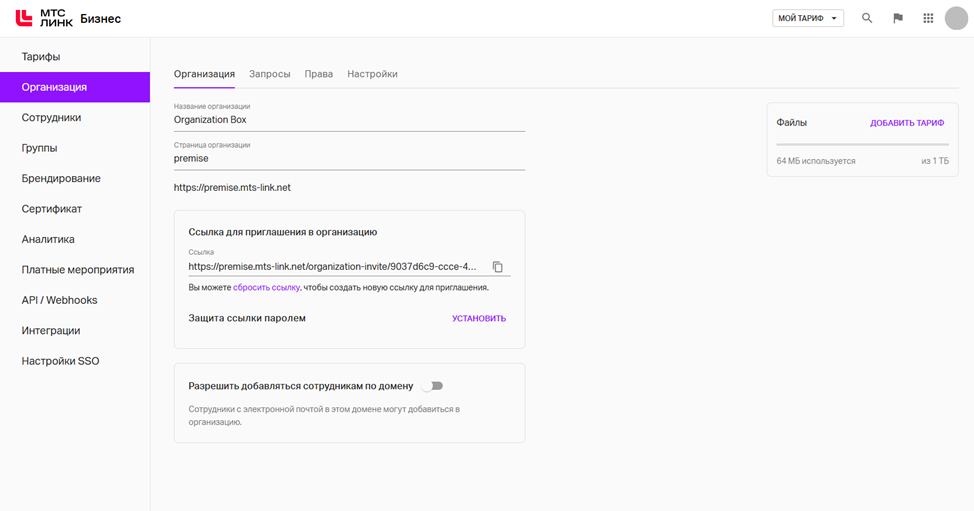 Примечание: так как речь идет о ПО МТС Линк on-premise, всем пользователям, добавленным в Организацию, будет назначаться тариф «BOX».