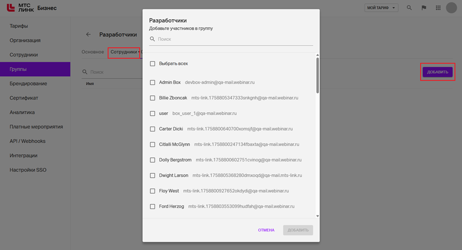 3. Перейти на вкладку «Сотрудники», нажать на кнопку «Добавить» и найти нужных Участников для добавления: