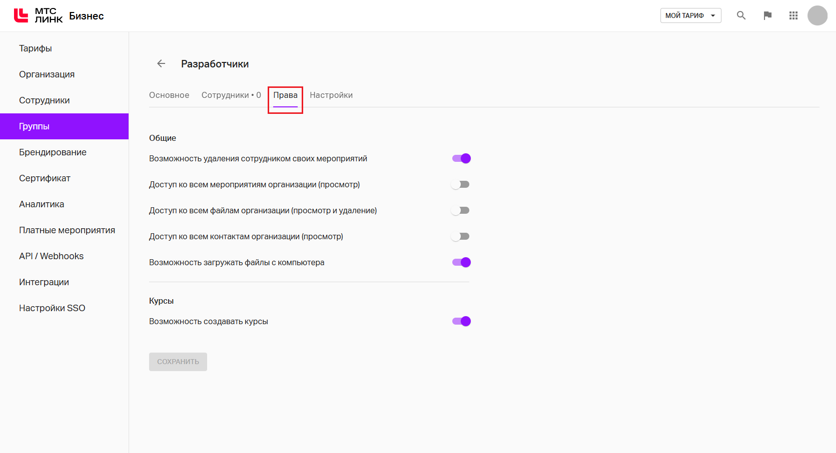 права сотрудникам, добавленным в группы: возможность удалять свои мероприятия, доступ ко всем мероприятиям, файлам и контактам Организации, возможность загружать файлы с компьютера. Такие права может устанавливать только Администратор;