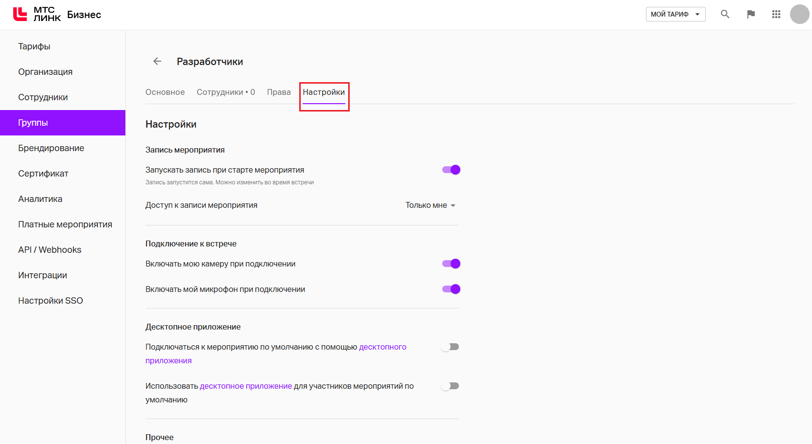 настройки сотрудникам, добавленным в группы: возможность по умолчанию запускать запись при старте мероприятия, доступ к записи, добавление мероприятий в календарь, подключение через десктопное приложение по умолчанию. Такие настройки сотрудник сможет самостоятельно изменить в своем профиле;