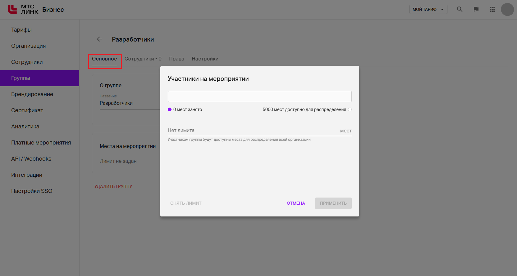 Для того, чтобы установить лимит Участников для мероприятий группы необходимо в разделе «Группы» выбрать группу, далее на вкладке «Основное» открыть настройку мест на мероприятии, в открывшемся окне установить нужные лимиты в рамках текущего тарифа и нажать на кнопку «Применить». Ограничения можно снять, нажав на кнопку «Снять лимит»: