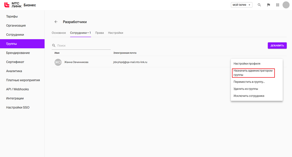 Там же можно сделать сотрудника Администратором, посмотреть его профиль, повторно выслать приглашение в Организацию, изменить тариф.