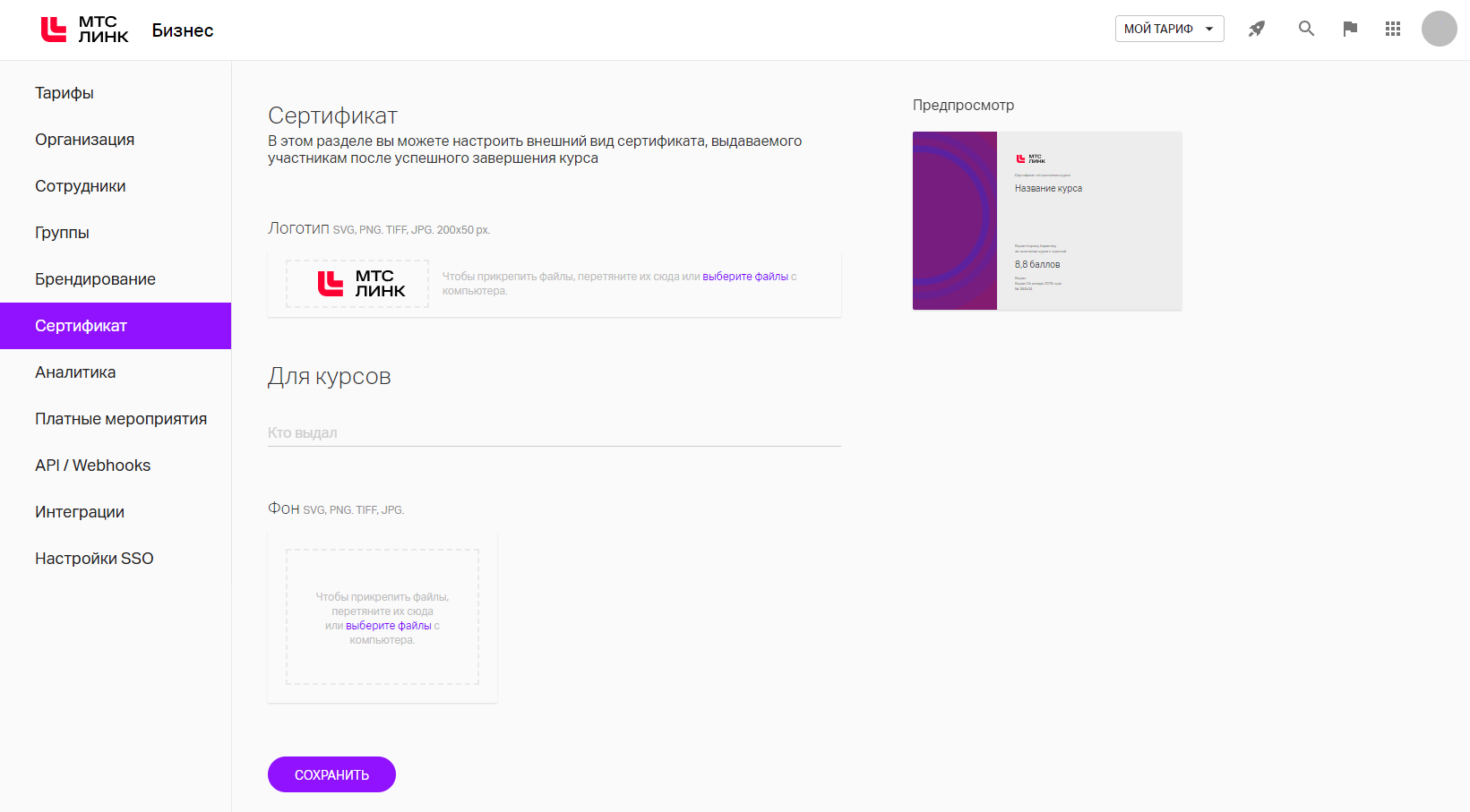 В разделе «Сертификат» можно настроить внешний вид сертификата, выдаваемого Участникам после завершения курса.