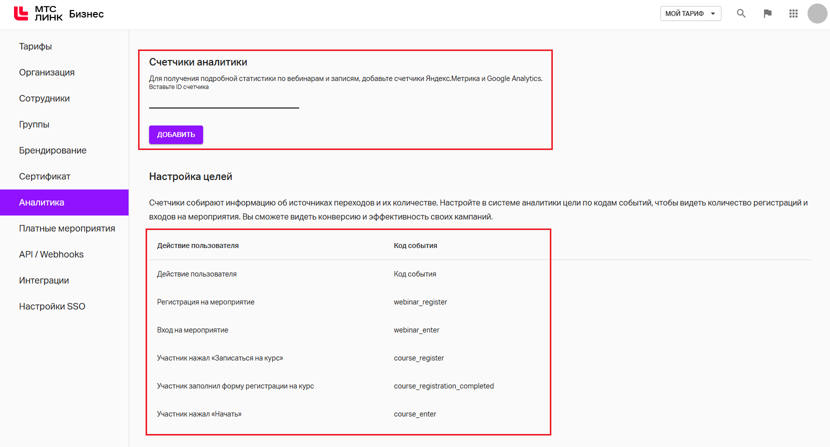 Платформа МТС Линк поддерживает аналитические сервисы Яндекс.Метрика и Google Analytics.