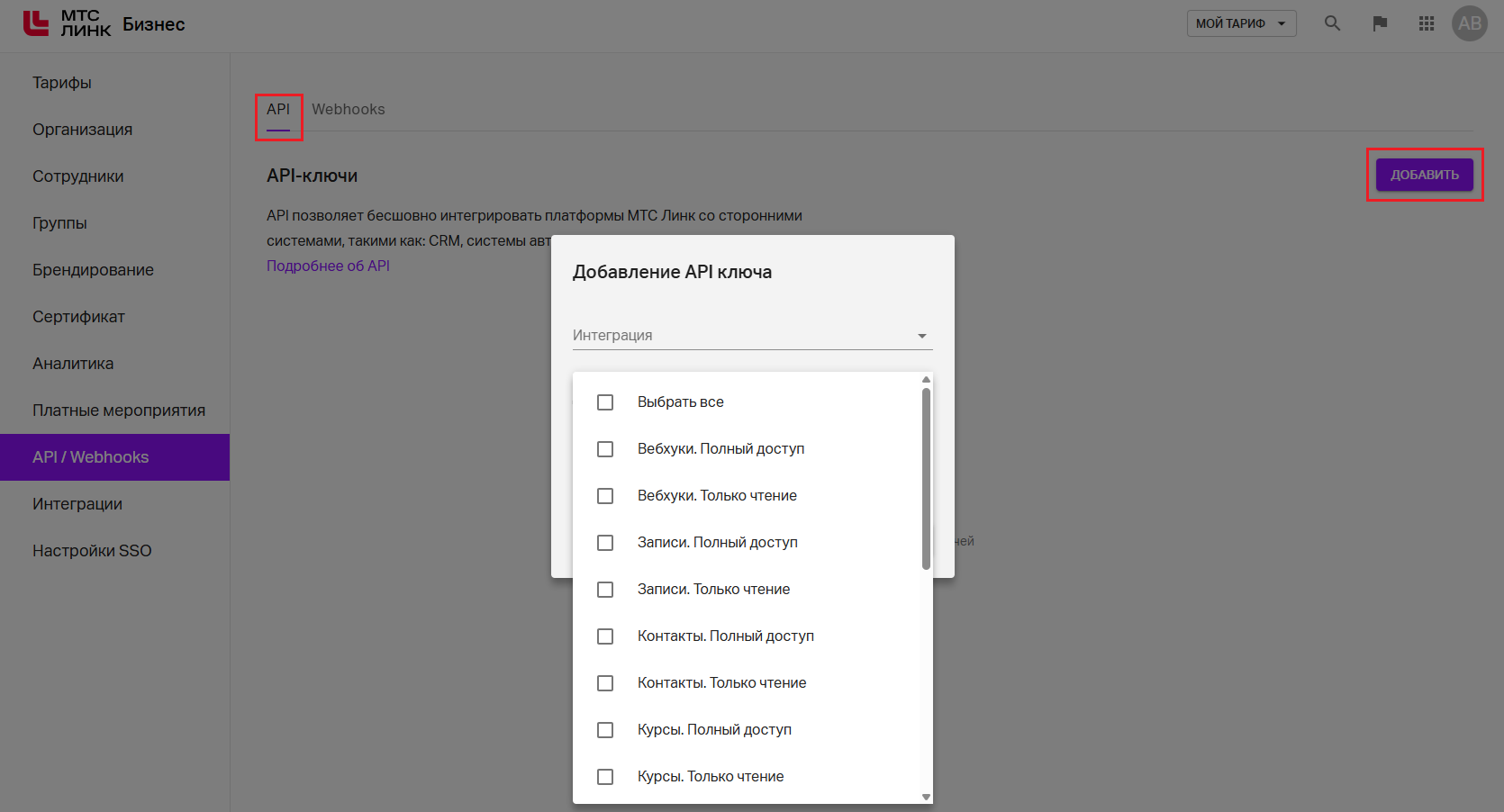 В разделе «API/Webhooks» на вкладке «API» можно добавить ключ для интеграции с сайтами клиентов, нажав на кнопку «Добавить» (Рис. 21). В открывшемся окне в поле «Интеграции» из выпадающего списка выбирается доступная интеграция, в поле «Доступы» — необходимые из них, комментарий добавляется по необходимости: