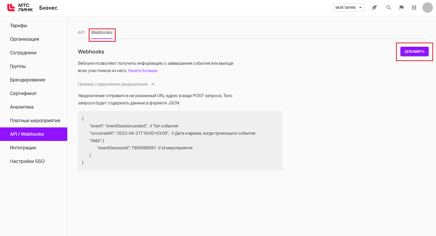 Для добавления нужно перейти на вкладку «Webhooks» раздела «API/Webhooks» и нажать на кнопку «Добавить»: