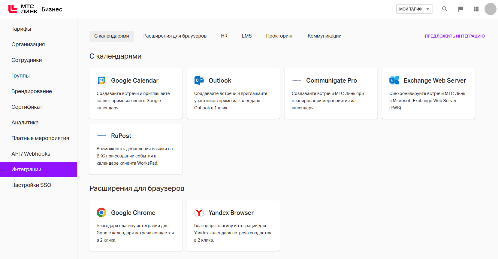 В разделе «Интеграции» доступны варианты интеграций платформы МТС Линк со следующими системами: