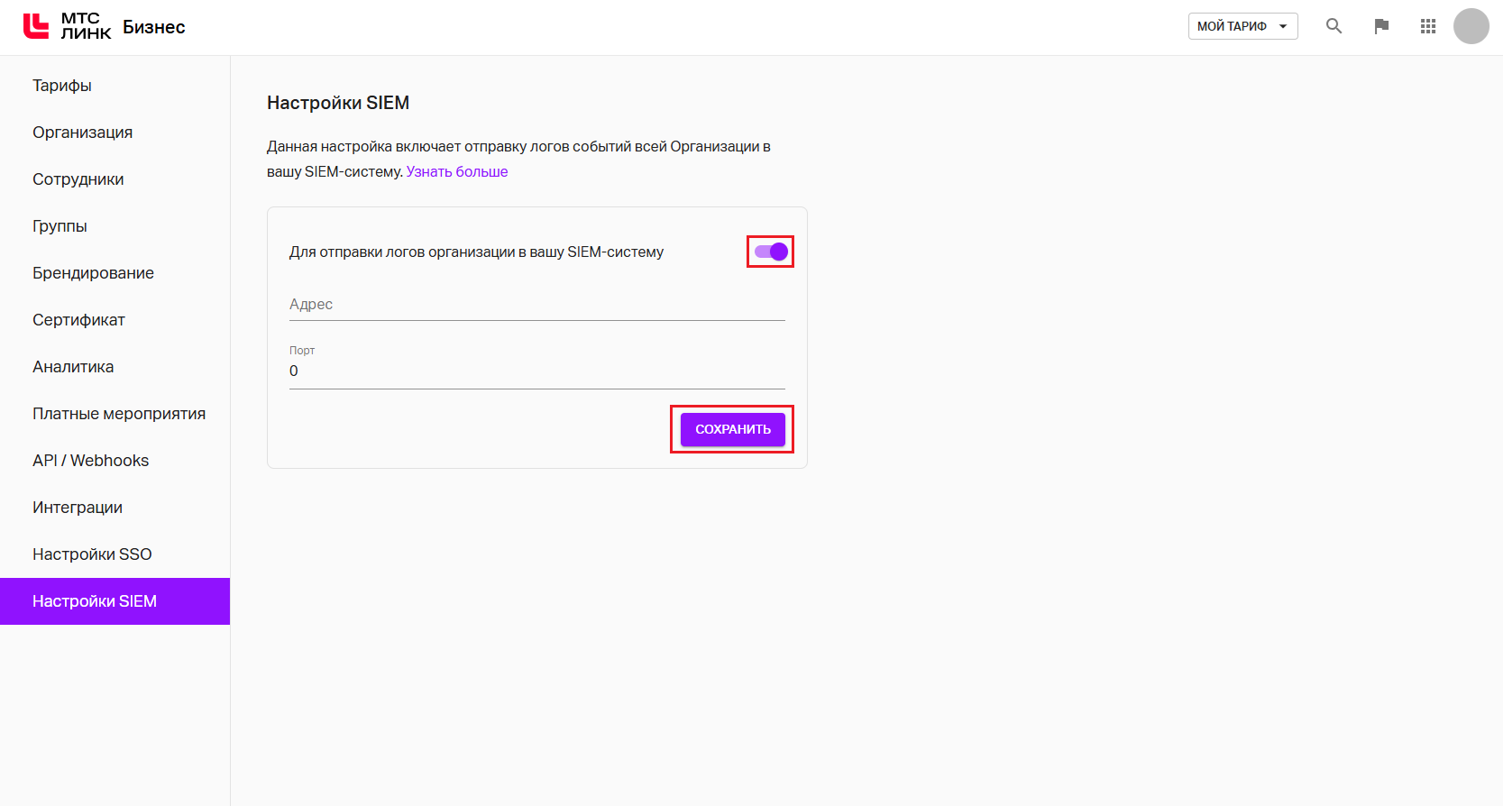 После подключения функционала в разделе «Бизнес» личного кабинета появится вкладка «Настройки SIEM». На ней нужно включить тумблер в правой части окна. Затем необходимо: