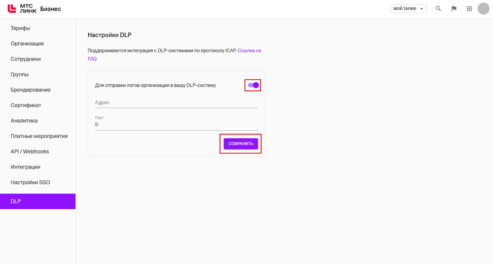 После подключения функционала в разделе «Бизнес» личного кабинета появится вкладка «DLP». На ней необходимо включить тумблер в правой части окна. Затем из настроек DLP-системы нужно взять значения параметров адреса и порта: