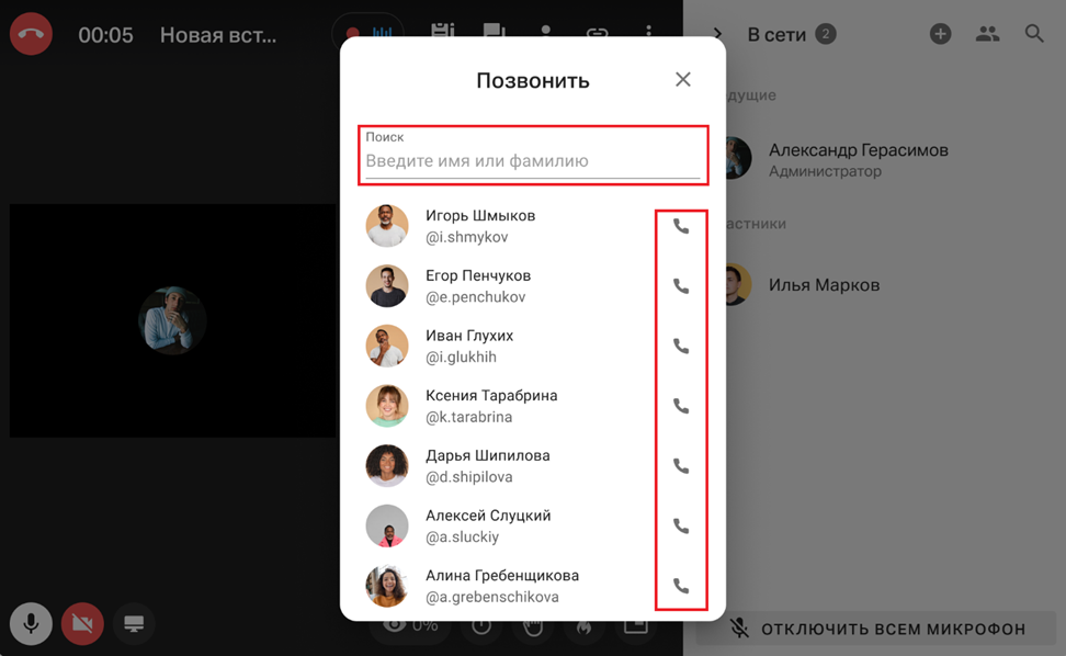 регистрационные данные (имя, фамилия, email, другие дополнительные поля). Для встречи с открытым входом в поле email будет отображаться «Гость» для Участников, которые вошли не по приглашению;