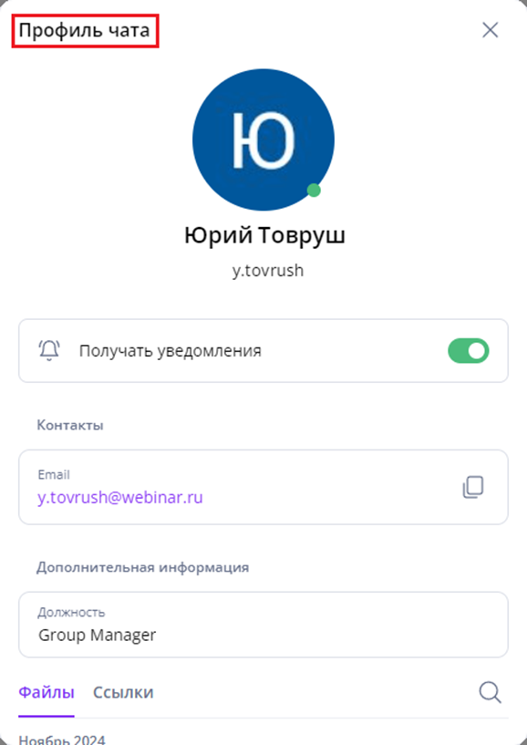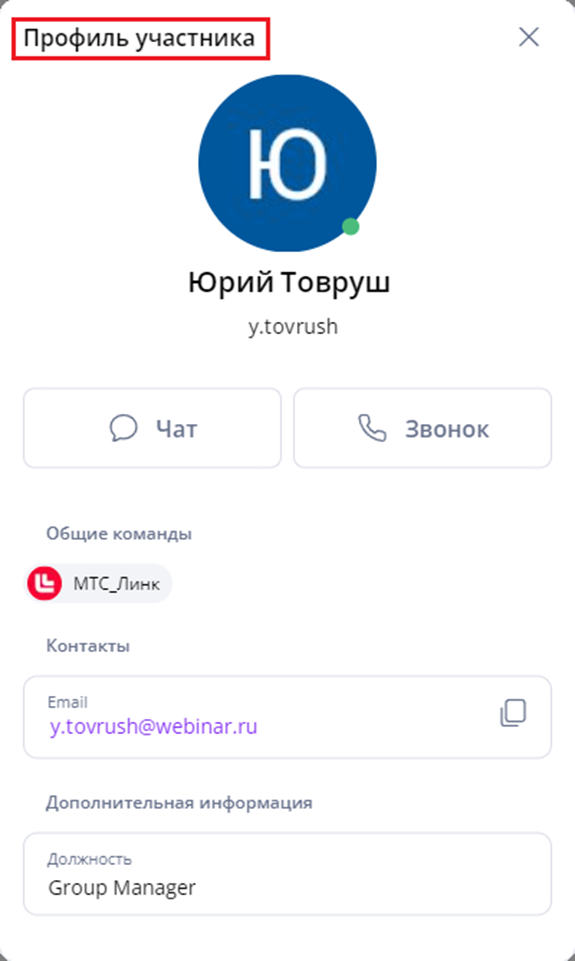 В ПО МТС Линк Чаты профили канала, группового или личного чата и профиль пользователя отличаются по содержанию и доступным функциям.