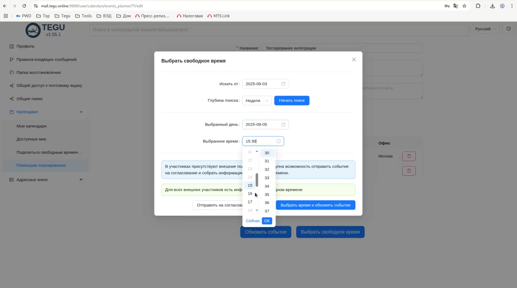 МТС Линк поддерживает интеграцию с календарем Tegu через функционал "Помощник планирования" в TEGU Enterprise. Эта интеграция позволяет оптимизировать процесс планирования встреч, включая согласование времени с участниками и бронирование ресурсов, таких как системы видеоконференцсвязи (ВКС). В этой статье мы расскажем, как настроить и использовать эту интеграцию.