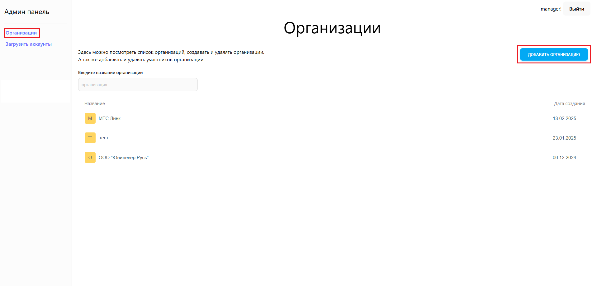 Для добавления новой Организации необходимо нажать на соответствующую кнопку в разделе «Организации» личного кабинета главного главного Администратора: