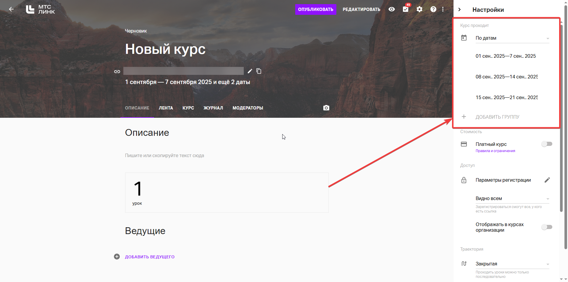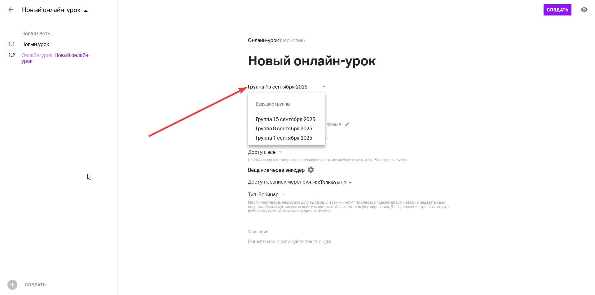 В онлайн-уроках можно будет задать дату проведения мероприятия для каждой из групп. Выбирая нужную группу в селекторе: