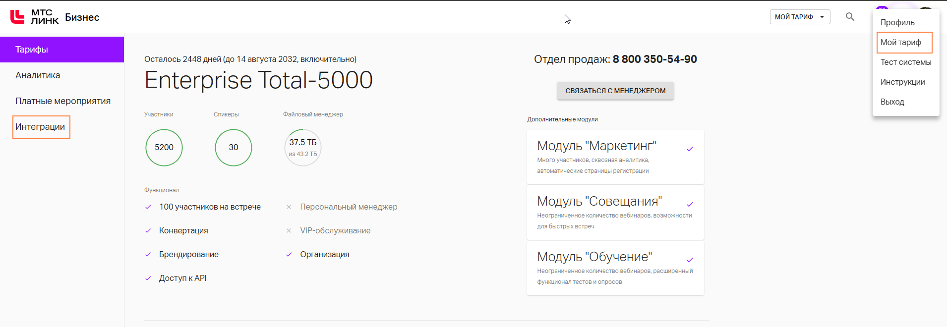 1. В личном кабинете МТС Линк перейдите в раздел "Мой тариф">"Интеграции"