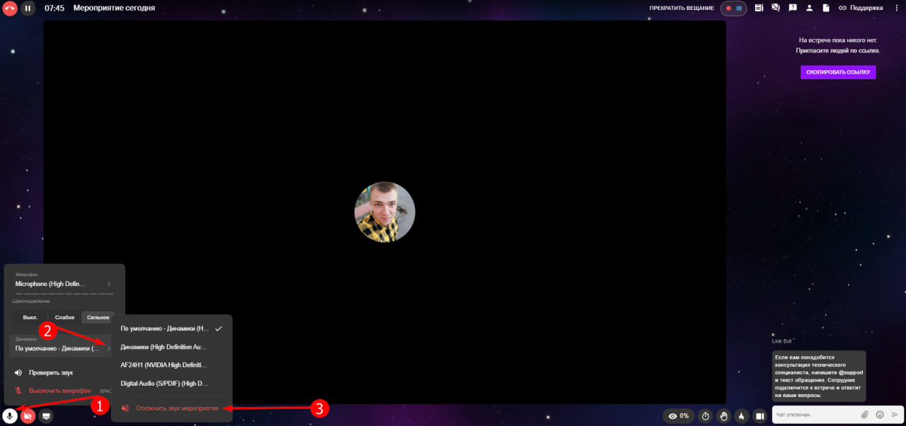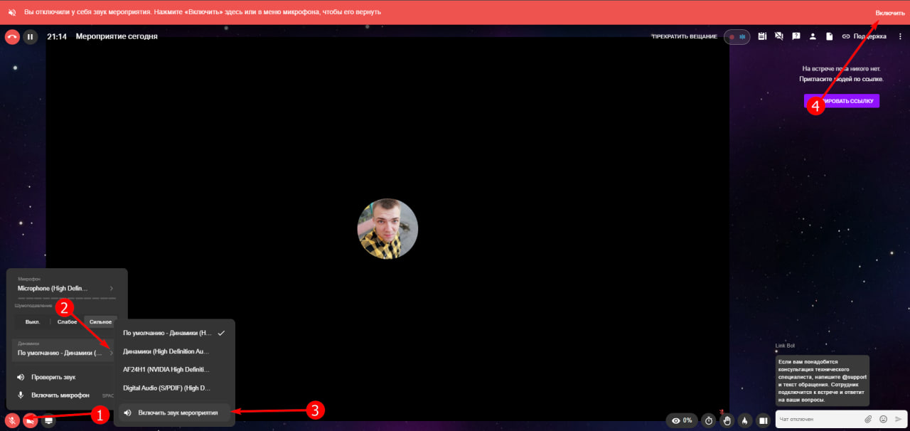 Чтобы отключить звук всего мероприятия для себя, выполните следующие действия: