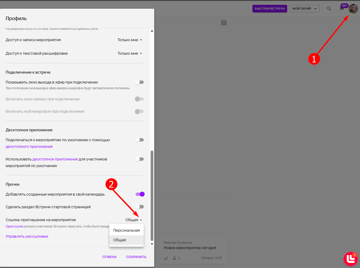 В настройках профиля организатора можно выбрать тип ссылки-приглашения на мероприятие: «Общая» или «Персональная». От этого выбора зависит, как участники получают доступ к мероприятию.