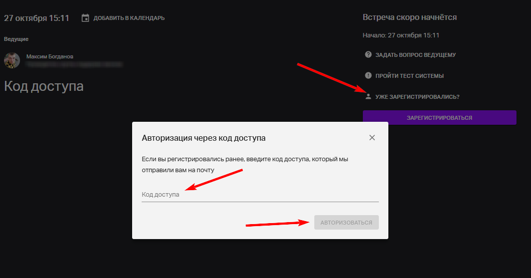 - В день мероприятия возвращается на лендинг, нажимает «Уже зарегистрировались?», вводит код и попадает в вебинарную комнату.