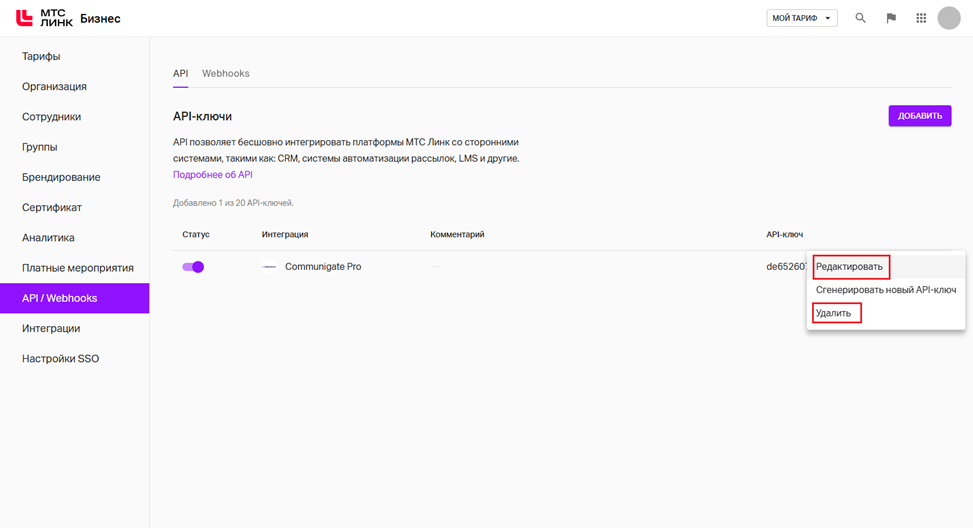 Для добавления ключа необходимо в разделе «Бизнес» личного кабинета МТС Линк перейти в подраздел «API/Webhooks» на вкладку «API» и нажать на кнопку «Добавить»: