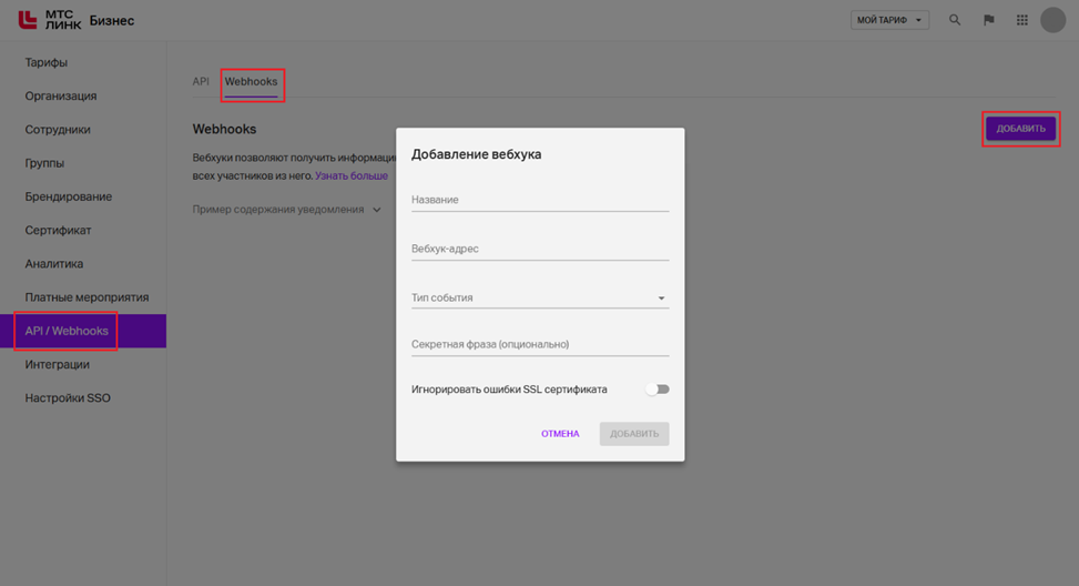Для добавления вебхука необходимо в разделе «Бизнес» личного кабинета МТС Линк перейти в подраздел «API/Webhooks», далее перейти на вкладку «Webhooks» и нажать на кнопку «Добавить»: