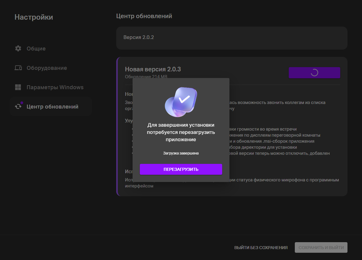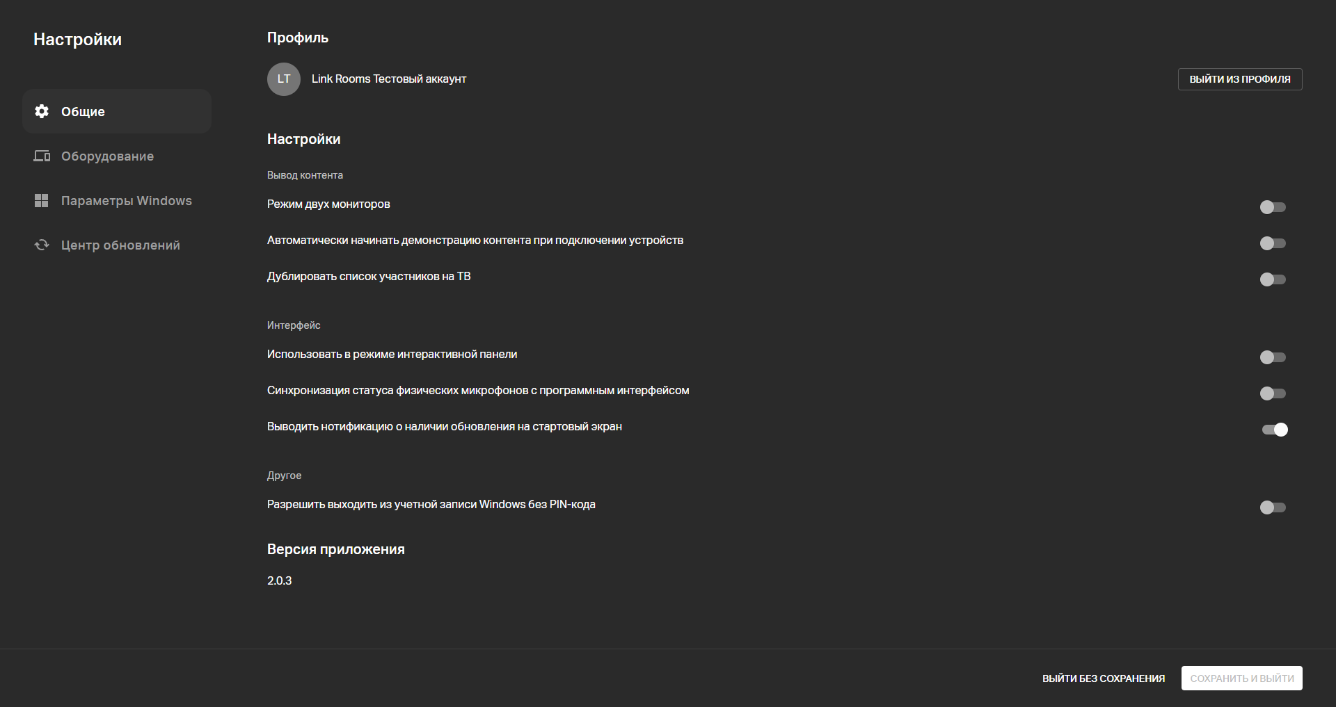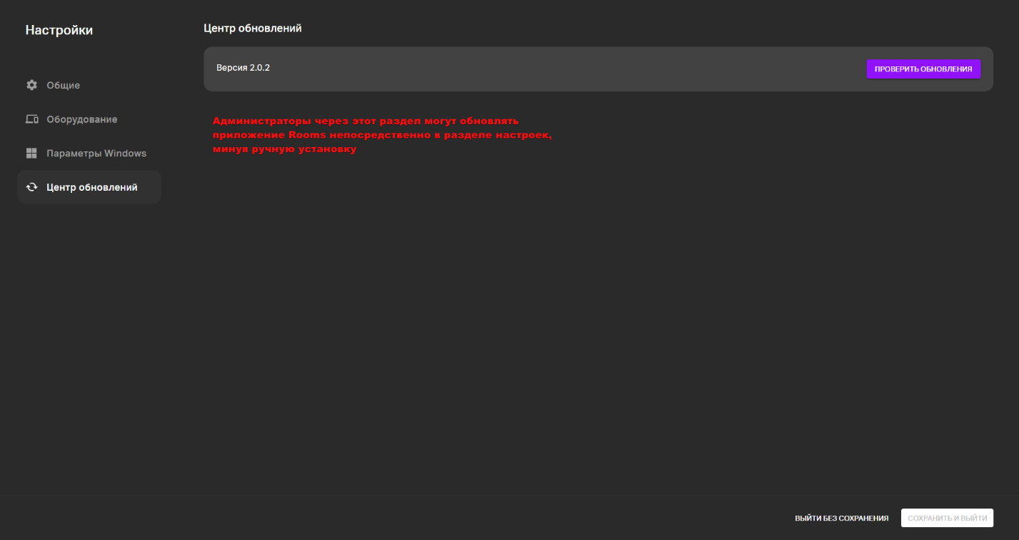 Здесь можно проверить установленную версию и проверить нет ли новых обновлений, и при необходимости обновиться. После обновления потребуется перезагрузка приложения Link Rooms
