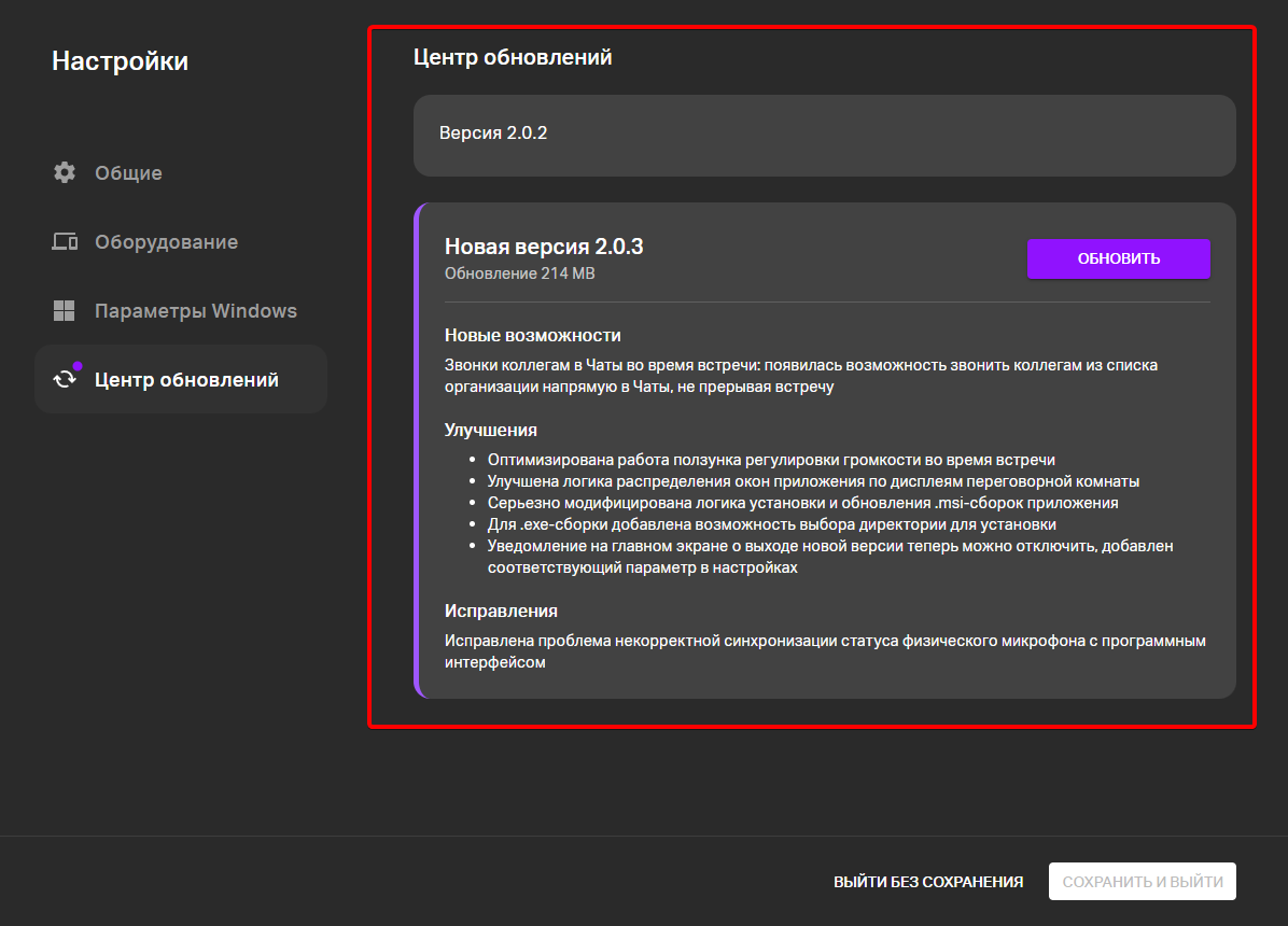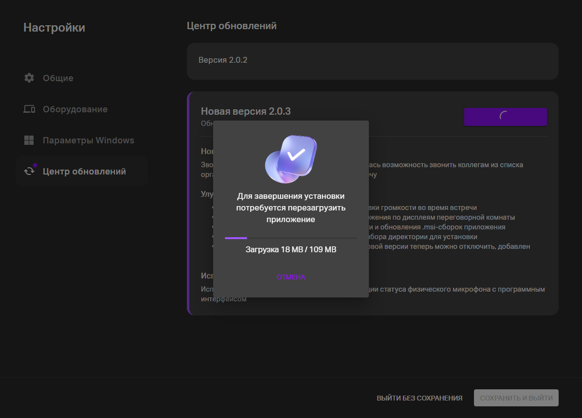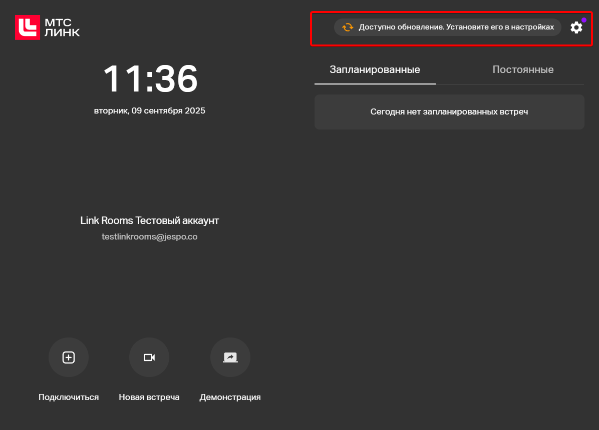 Здесь можно проверить установленную версию и проверить нет ли новых обновлений, и при необходимости обновиться. После обновления потребуется перезагрузка приложения Link Rooms