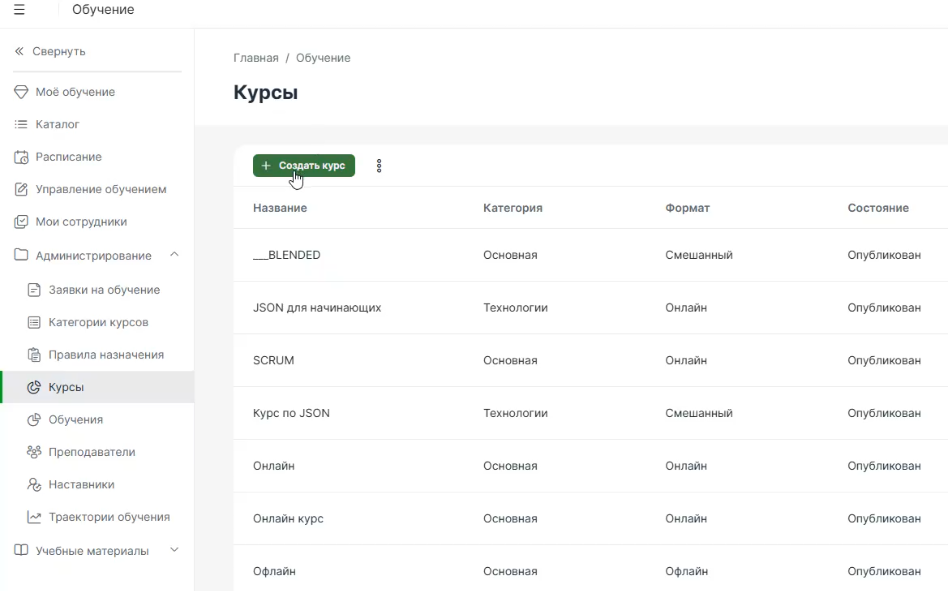 В Личном кабинете Nexign Neon перейдите в раздел Курсы и нажмите кнопку "Создать курс".