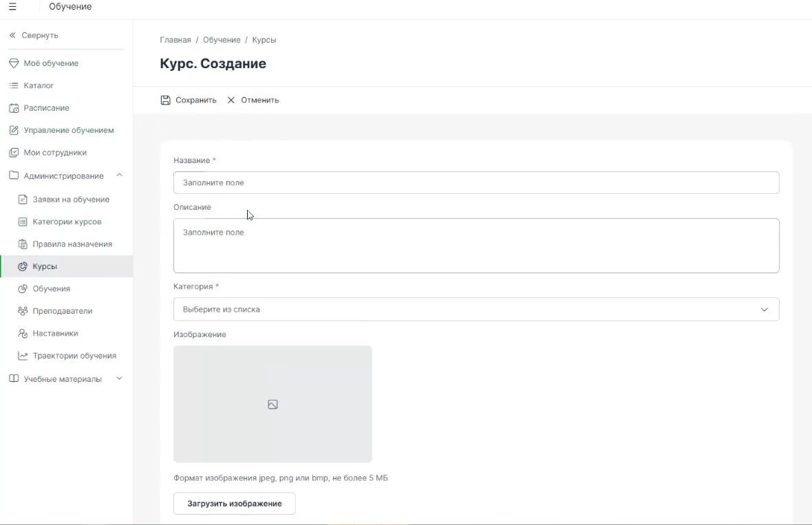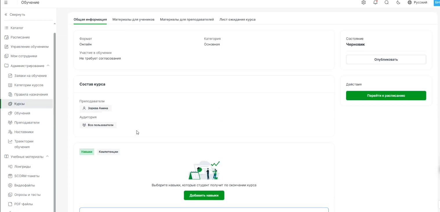 После заполнения обязательных полей и нажатия кнопки "Сохранить" можно просмотреть общую информацию о созданном курсе, добавить в него материалы для учеников и для преподавателей. Есть возможность сотрудникам записываться в лист ожидания.